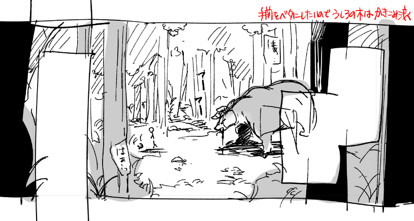 今回は舞台が森なんですが、これも「ちゃんとかけるのかなあ」と不安だったのでとりあえずかけそうなページを描いてみました。