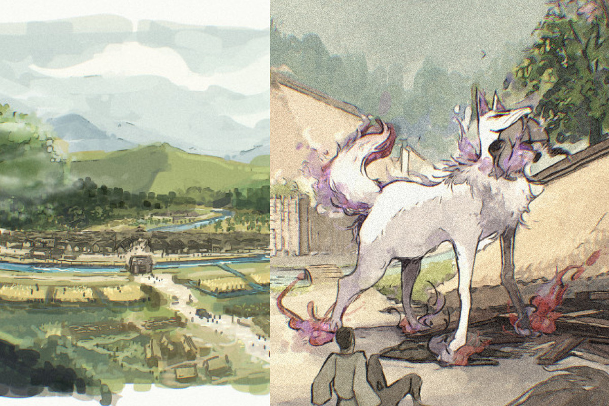 絵としての見た目優先で色々つけたしてしまったなあ。本当にモノケモノの世界がこうなるかはわからないですが…(田んぼそこにあってええんか?と思う)