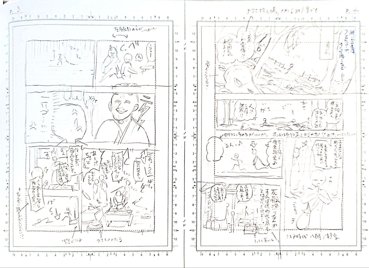 今回のネームはミニミニネームを最初につくって、サムネイルノートに本ネームを描き起こす、というやり方でやりました。
